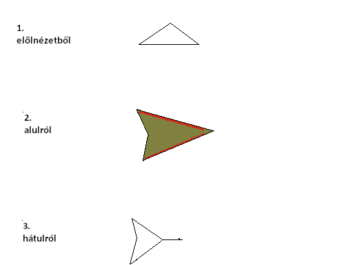 A végén (c) oldal nem egyenes, hanem az "orral" megegyezõ beszögellésû háromszöget formáz. (A légy szárnyaira emlékeztet.) Ekkor vált láthatóvá, hogy a szárnyak külsõ szélein piros csíkok vannak.