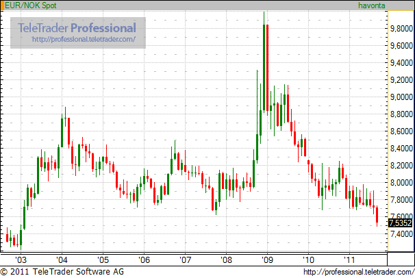 A hírügynökség felhívja a figyelmet arra, hogy a norvég korona a világ legfõbb devizái közül a legjobb teljesítményt nyújtotta az emlékezetes augusztus 5-i nap óta, amikor az S&P leminõsítette az Egyesült Államokat. Közben a norvég állampapírok is egyre vonzóbbak: a kétéves futamidejû államkötvény hozama történelmi mélypontjára esett, a 10 éves kötvényhozam pedig csak 3 bázispontra jár a rekordalacsony szinttõl.