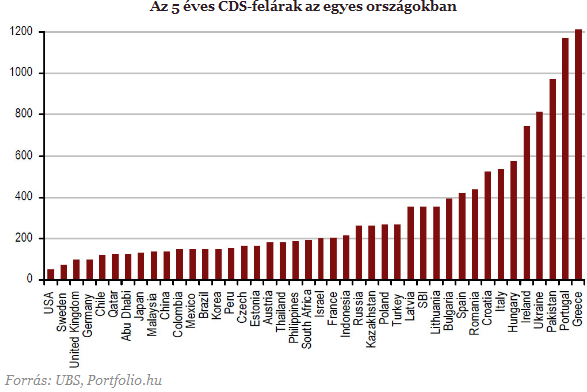 A tízes lista ötödik helyén szerepel tehát egy euróövezeten kívüli államcsõd bekövetkezésének esélye. A UBS elemõi ennek kapcsán úgy fogalmaznak, hogy senki sem lepõdne meg azon, ha 2012-ben egy euróövezeti ország becsõdölne. Görögország esetében szinte biztos az államcsõd, csak annak formája és idõzítése a kérdés. Az lenne igazán meglepõ, ha egy feltörekvõ ország menne csõdbe - írják a közgazdászok. Ahogyan korábban több elemzésünkben is rámutattunk, a feltörekvõ piaci államok mérlege és fiskális fenntarthatósági folyamatai kedvezõnek mondhatók. De van néhány kockázatos eset - emelik ki a UBS elemzõi, akik ennek kapcsán az 5 éves CDS-felárakat hasonlítják össze. Ezek alapján kiemelkedõ az államcsõd valószínûsége Pakisztánban, Ukrajnában, Magyarországon és Horvátországban.